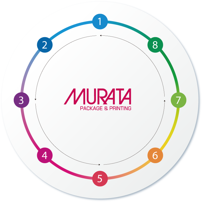 邨田印刷では、総合印刷会社としての幅広いノウハウや知識を活かし、社外共創企業とのネットワークを図ることで、お客さまが要求する印刷製品や幅広い関連サービスを一括して請け負う「ワンストップサービス」を実現しています。営業窓口へのワンオーダーに対し企画から開発、デザイン、印刷、納品に至るまで、すべての業務を一元化することで分業化に伴って発生していたムダを解消し、品質の安定につなげます。